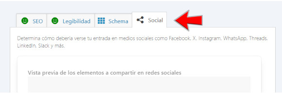 Allí verás varias pestañas: SEO, Legibilidad, Esquema… y Social.
